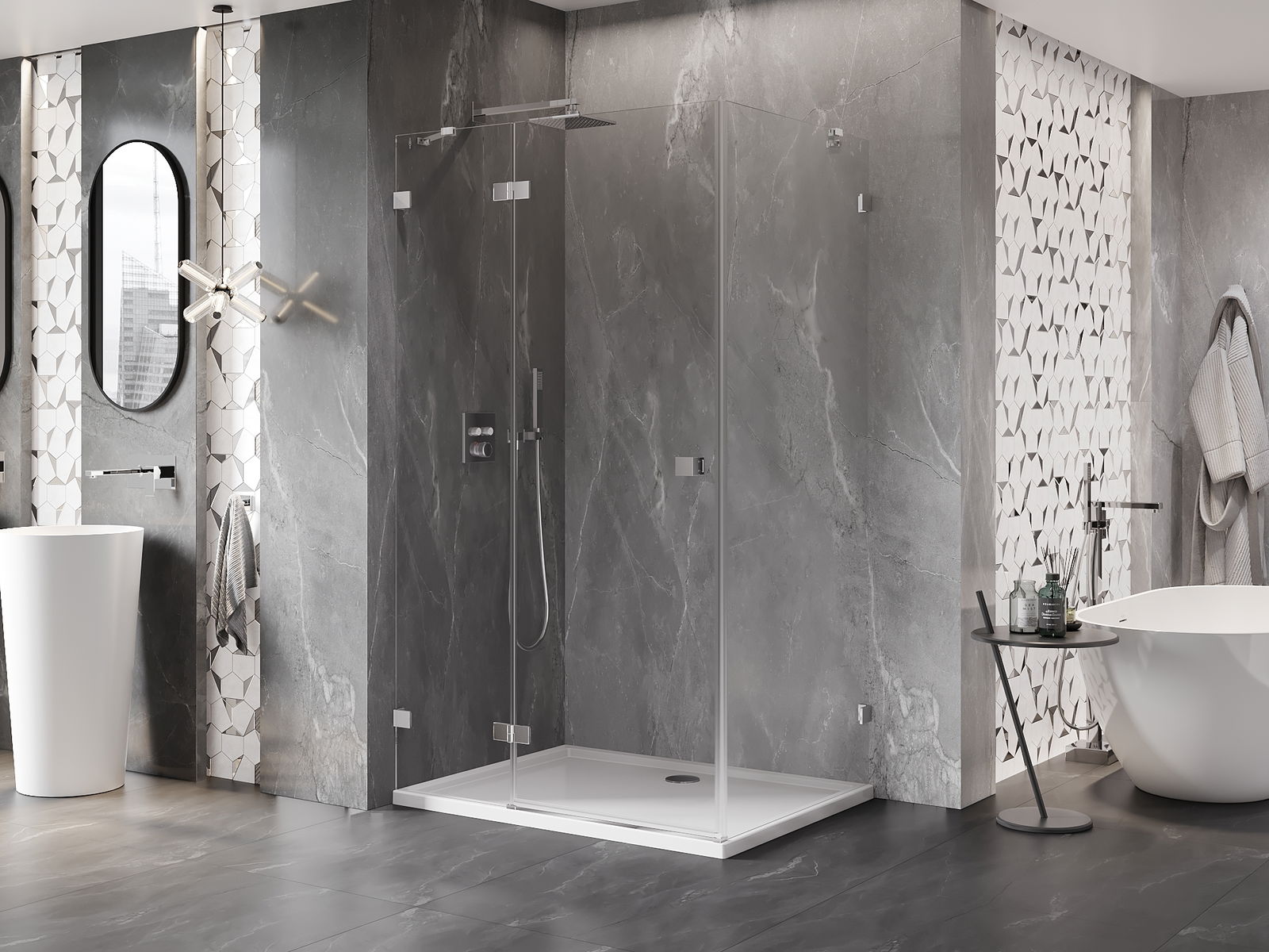Priročen in udoben ročaj je izdelan iz trpežnega in odpornega kovine. Modna oblika v kombinaciji z zaključkom, ki ustreza barvi profilov, daje celoti sodoben in stilski videz, poudarjajoč estetiko vsake kopalnice.