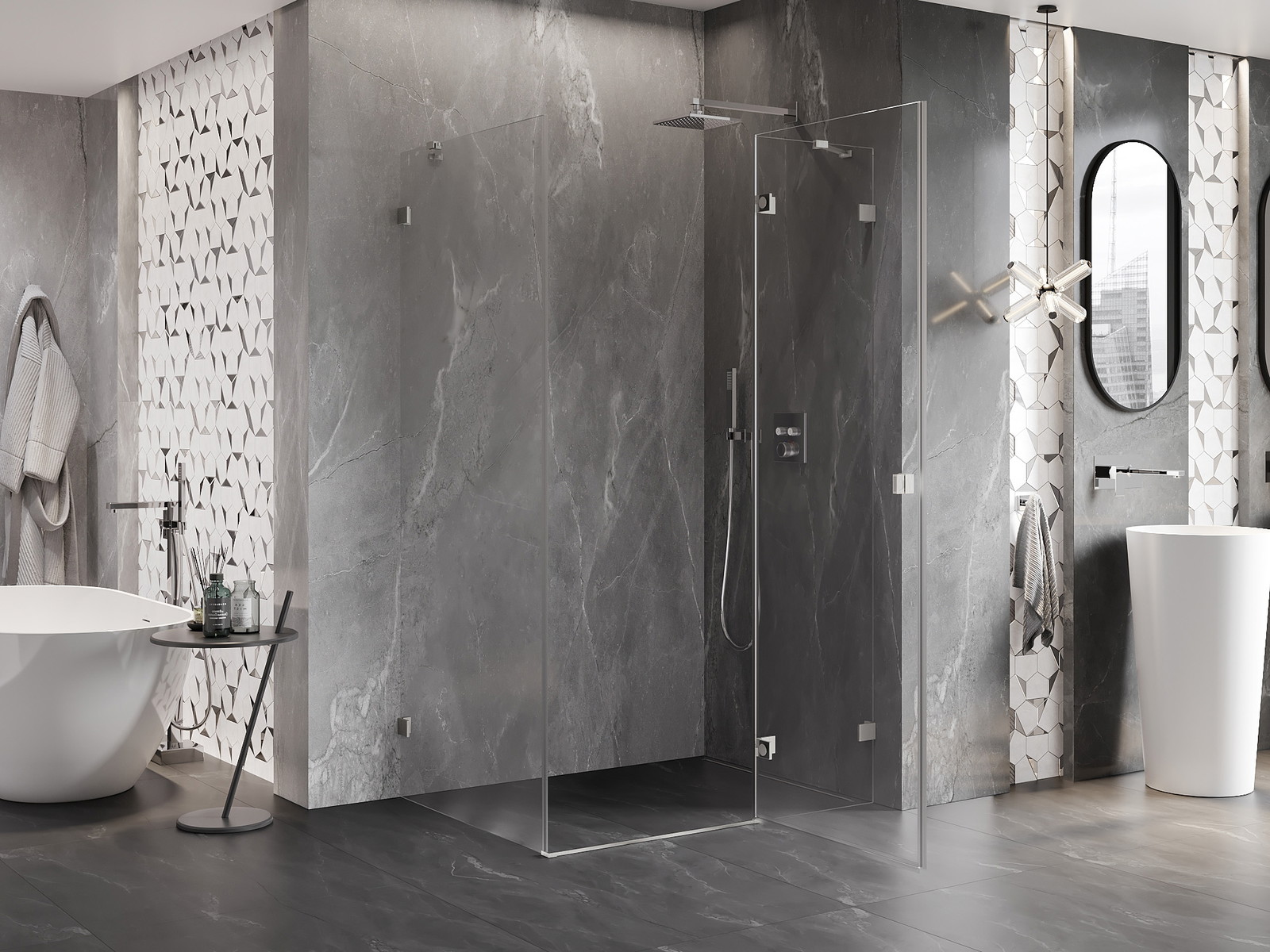 Priročen in udoben ročaj je izdelan iz trpežnega in odpornega kovine. Modna oblika v kombinaciji z zaključkom, ki ustreza barvi profilov, daje celoti sodoben in stilski videz, poudarjajoč estetiko vsake kopalnice.