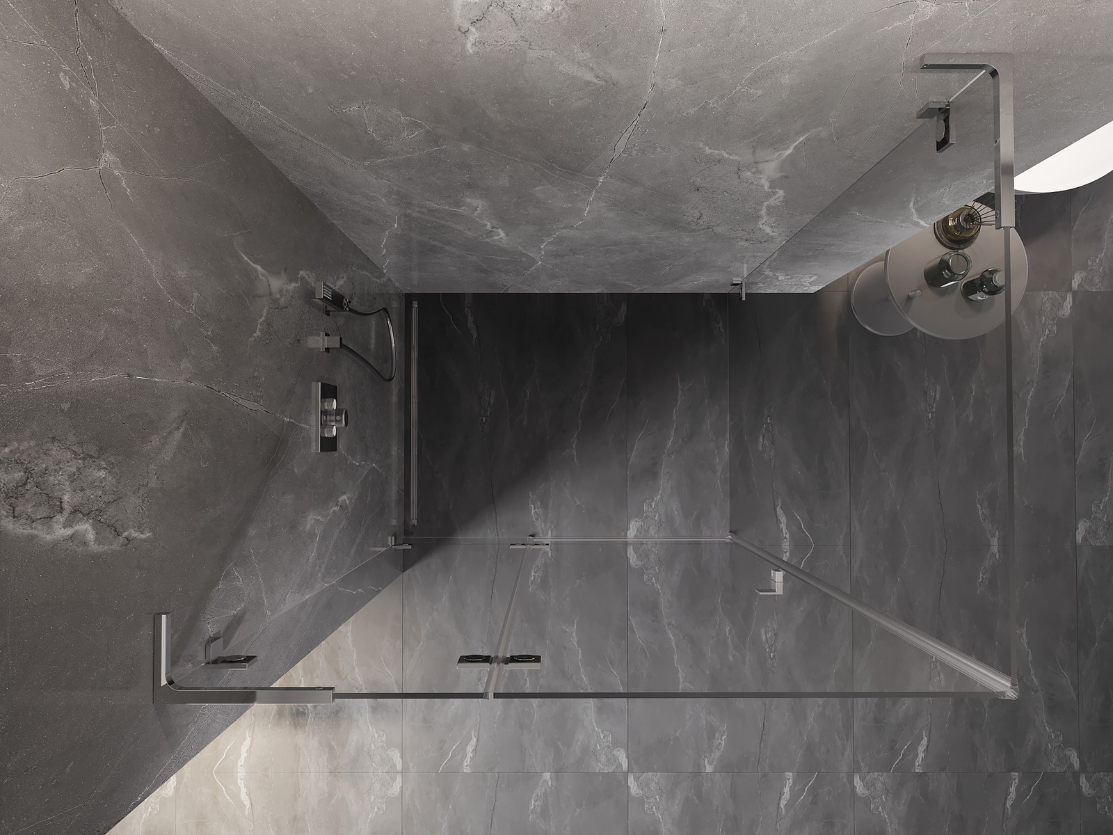 Priročen in udoben ročaj je izdelan iz trpežnega in odpornega kovine. Modna oblika v kombinaciji z zaključkom, ki ustreza barvi profilov, daje celoti sodoben in stilski videz, poudarjajoč estetiko vsake kopalnice.