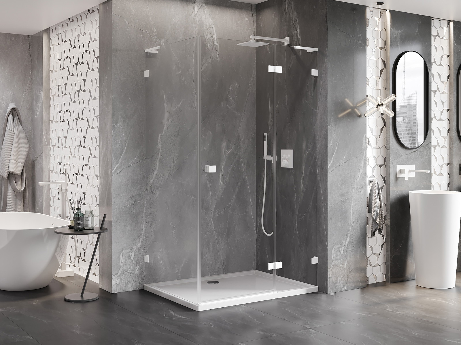Priročen in udoben ročaj je izdelan iz trpežnega in odpornega kovine. Modna oblika v kombinaciji z zaključkom, ki ustreza barvi profilov, daje celoti sodoben in stilski videz, poudarjajoč estetiko vsake kopalnice.