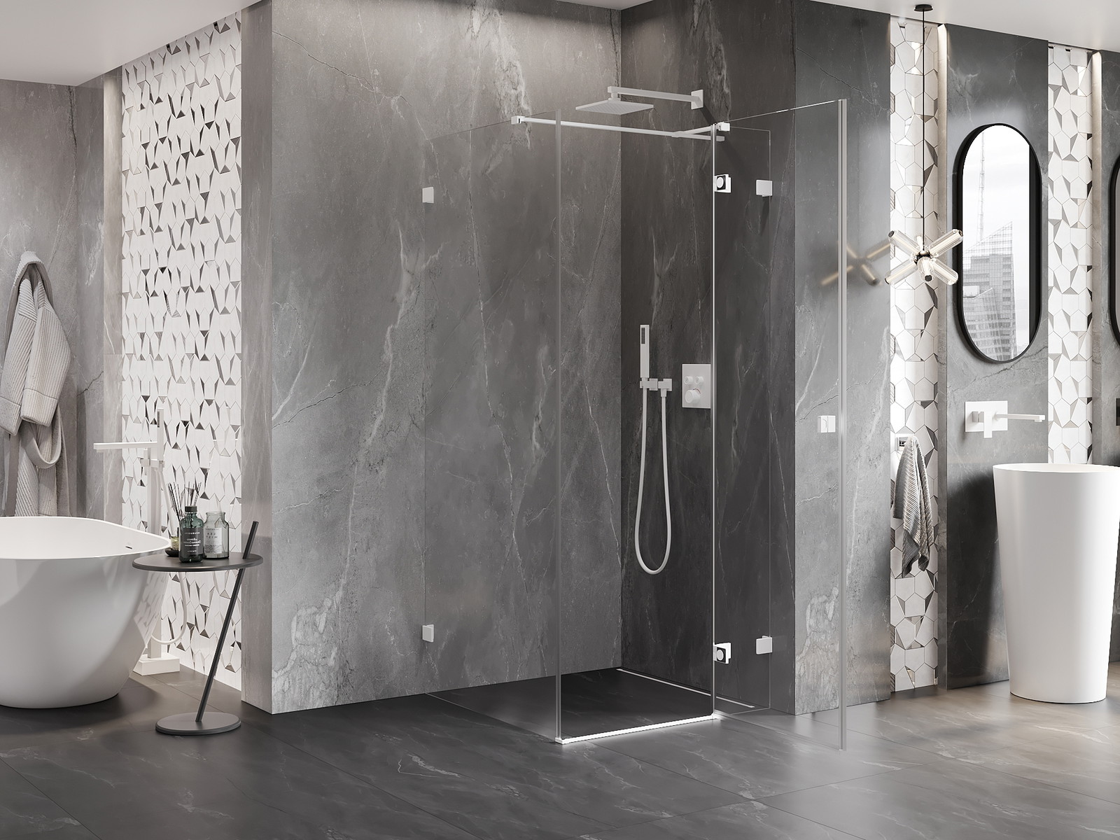Priročen in udoben ročaj je izdelan iz trpežnega in odpornega kovine. Modna oblika v kombinaciji z zaključkom, ki ustreza barvi profilov, daje celoti sodoben in stilski videz, poudarjajoč estetiko vsake kopalnice.