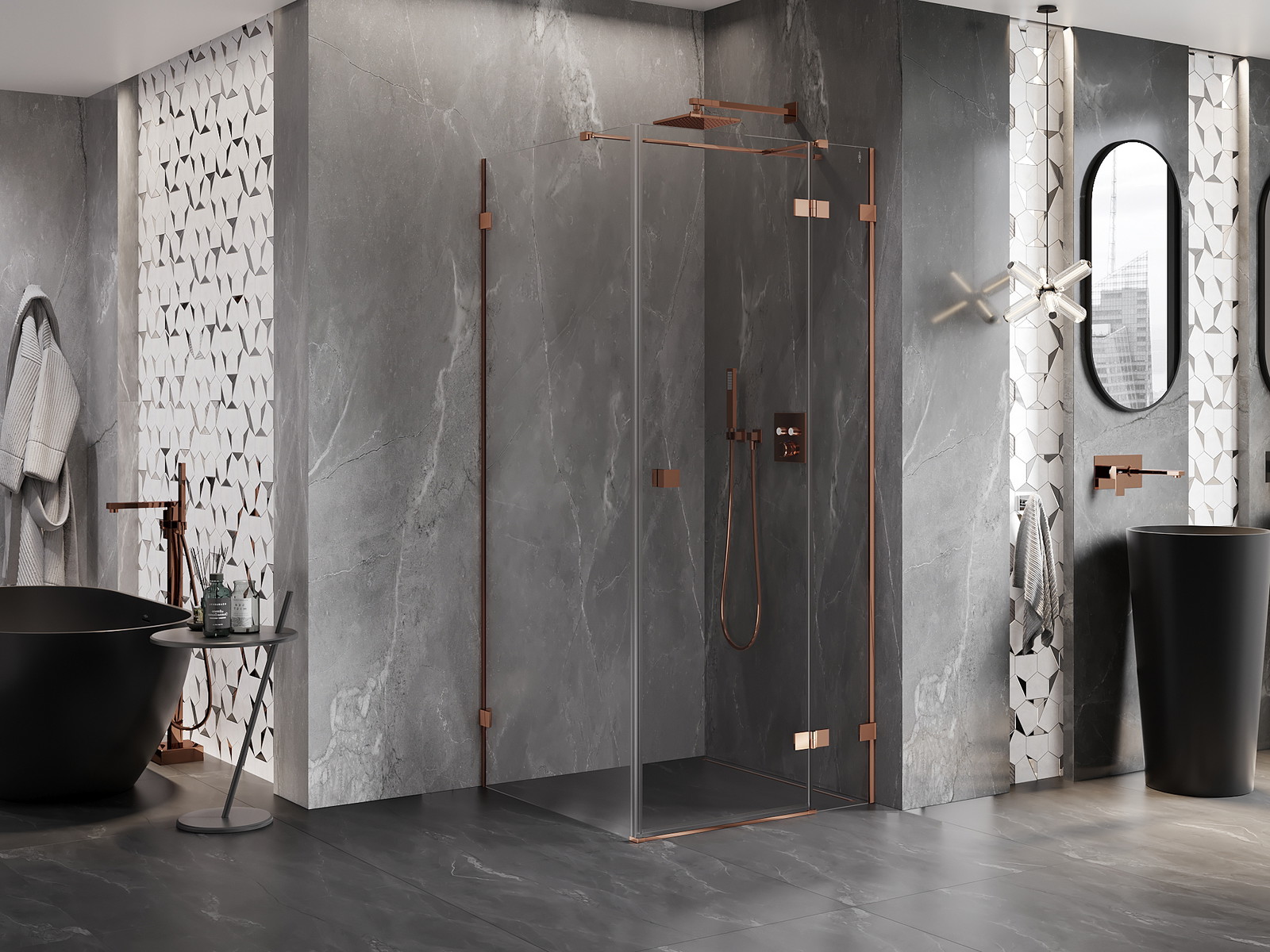 Priročen in udoben ročaj je izdelan iz trpežnega in odpornega kovine. Modna oblika v kombinaciji z zaključkom, ki ustreza barvi profilov, daje celoti sodoben in stilski videz, poudarjajoč estetiko vsake kopalnice.