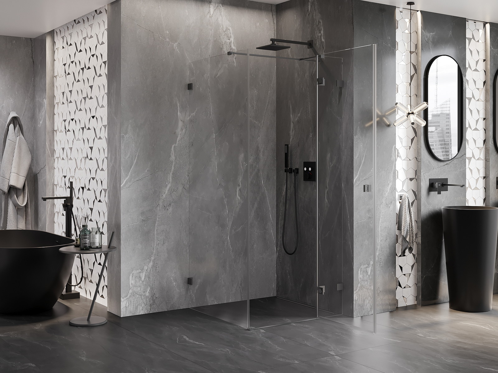 Priročen in udoben ročaj je izdelan iz trpežnega in odpornega kovine. Modna oblika v kombinaciji z zaključkom, ki ustreza barvi profilov, daje celoti sodoben in stilski videz, poudarjajoč estetiko vsake kopalnice.