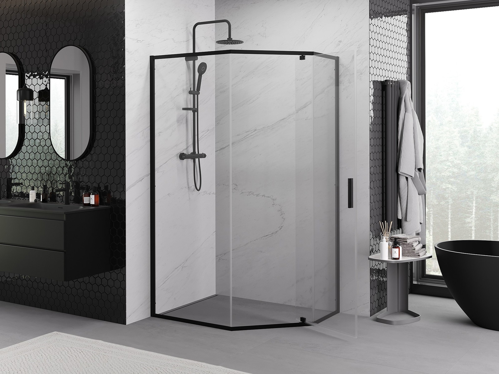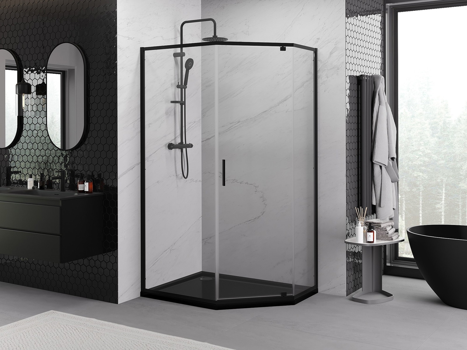 Priročen in udoben ročaj je izdelan iz trpežnega in odpornega kovine. Modna oblika v kombinaciji z zaključkom, ki ustreza barvi profilov, daje celoti sodoben in stilski videz, poudarjajoč estetiko vsake kopalnice.