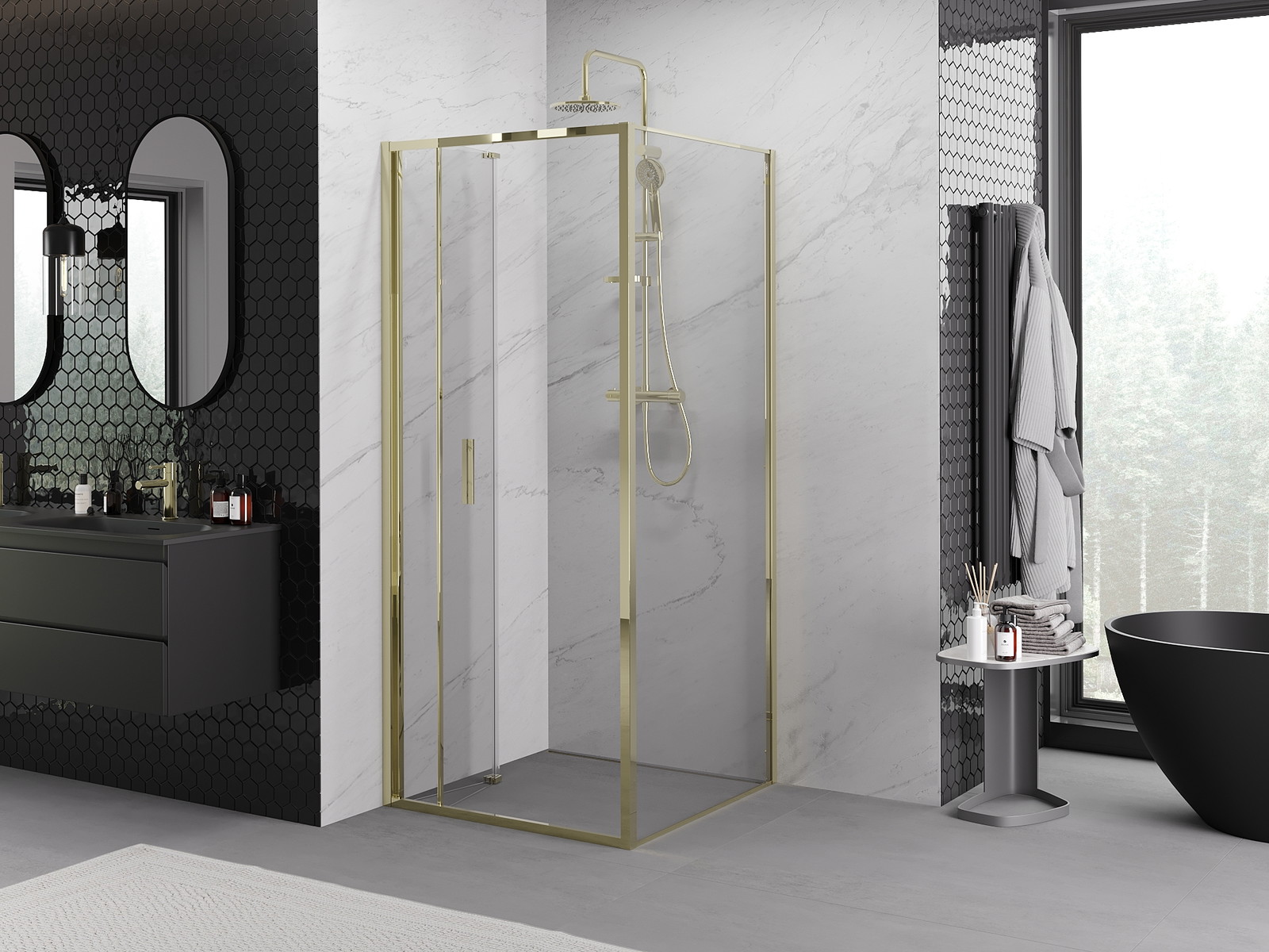 Priročen in udoben ročaj je izdelan iz trpežnega in odpornega kovine. Modna oblika v kombinaciji z zaključkom, ki ustreza barvi profilov, daje celoti sodoben in stilski videz, poudarjajoč estetiko vsake kopalnice.