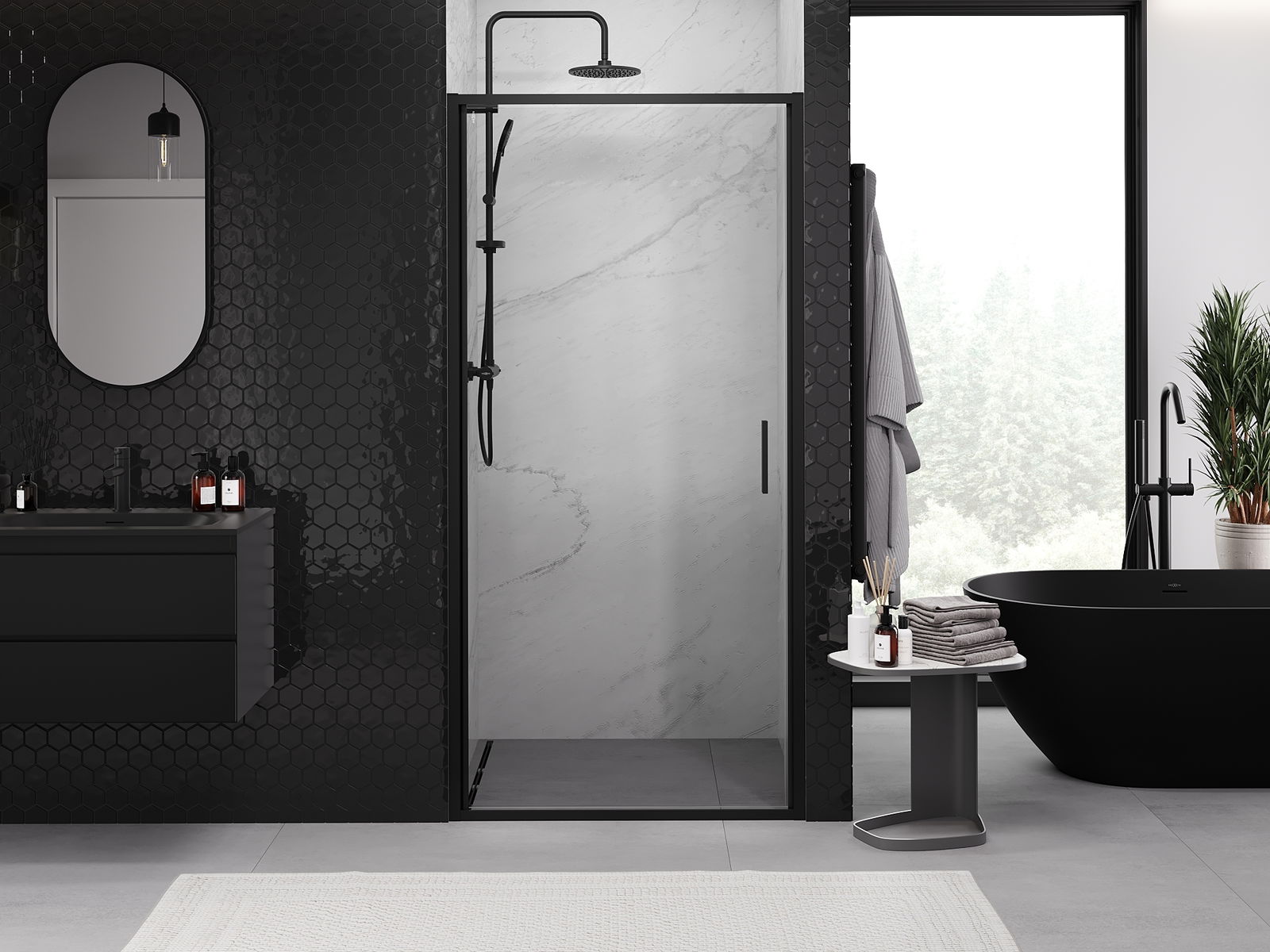 Priročen in udoben ročaj je izdelan iz trpežnega in odpornega kovine. Modna oblika v kombinaciji z zaključkom, ki ustreza barvi profilov, daje celoti sodoben in stilski videz, poudarjajoč estetiko vsake kopalnice.