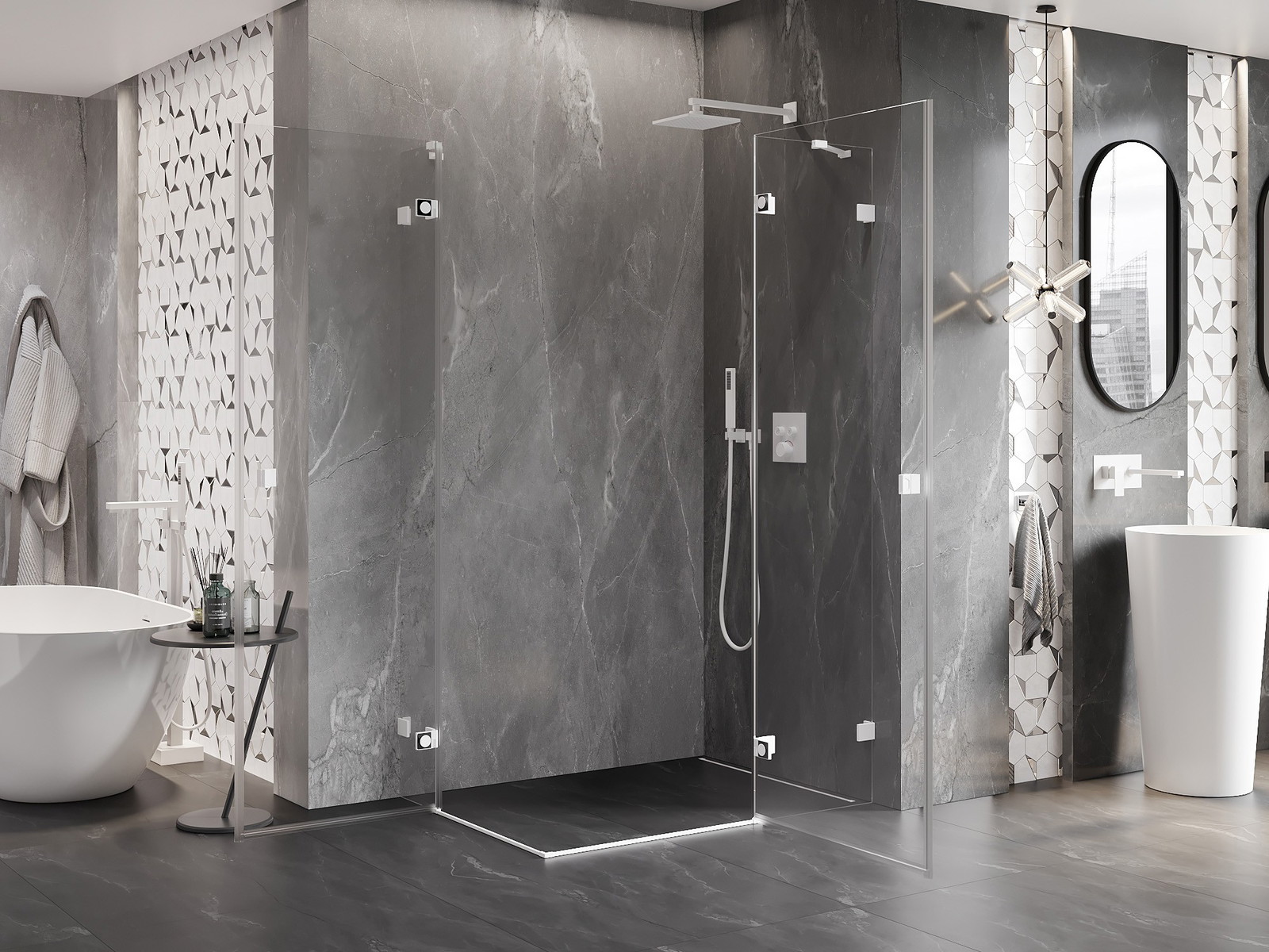 Priročen in udoben ročaj je izdelan iz trpežnega in odpornega kovine. Modna oblika v kombinaciji z zaključkom, ki ustreza barvi profilov, daje celoti sodoben in stilski videz, poudarjajoč estetiko vsake kopalnice.