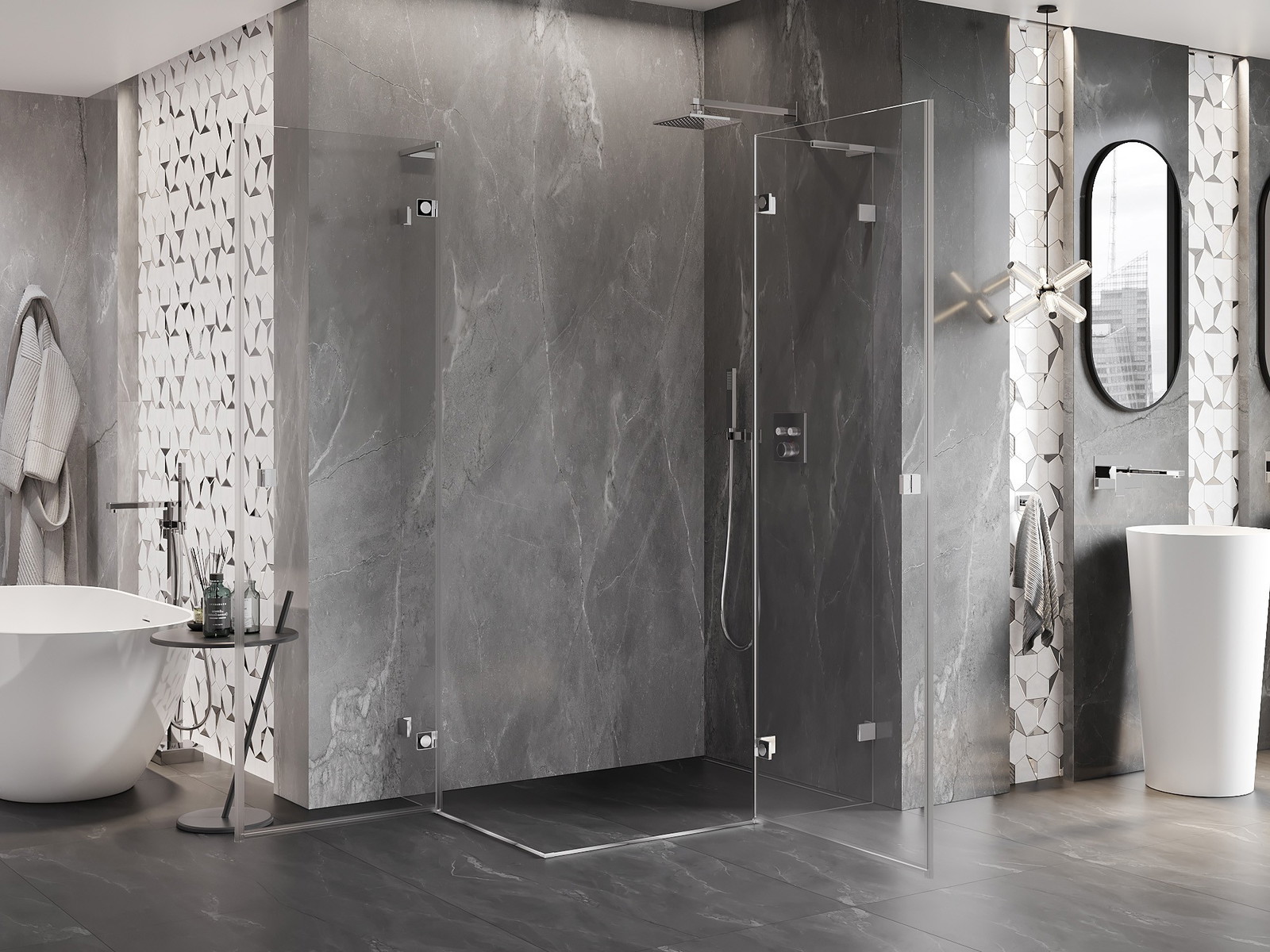 Priročen in udoben ročaj je izdelan iz trpežnega in odpornega kovine. Modna oblika v kombinaciji z zaključkom, ki ustreza barvi profilov, daje celoti sodoben in stilski videz, poudarjajoč estetiko vsake kopalnice.