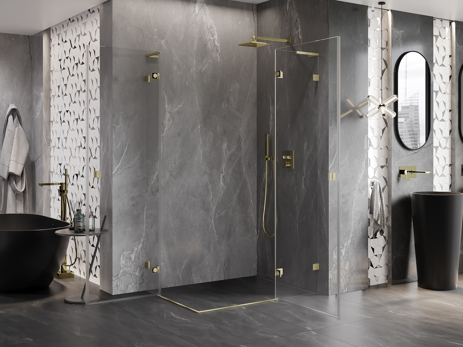 Sponke in tečaji so izdelani iz zelo trpežne medenine in dodatno ustvarjajo poravnano površino stekla. To je odlična izbira, ki združuje eleganco, vzdržljivost in sodoben dizajn. Zaradi takšnih rešitev prha pridobi na estetiki, hkrati pa olajšajo vzdrževanje čistoče.