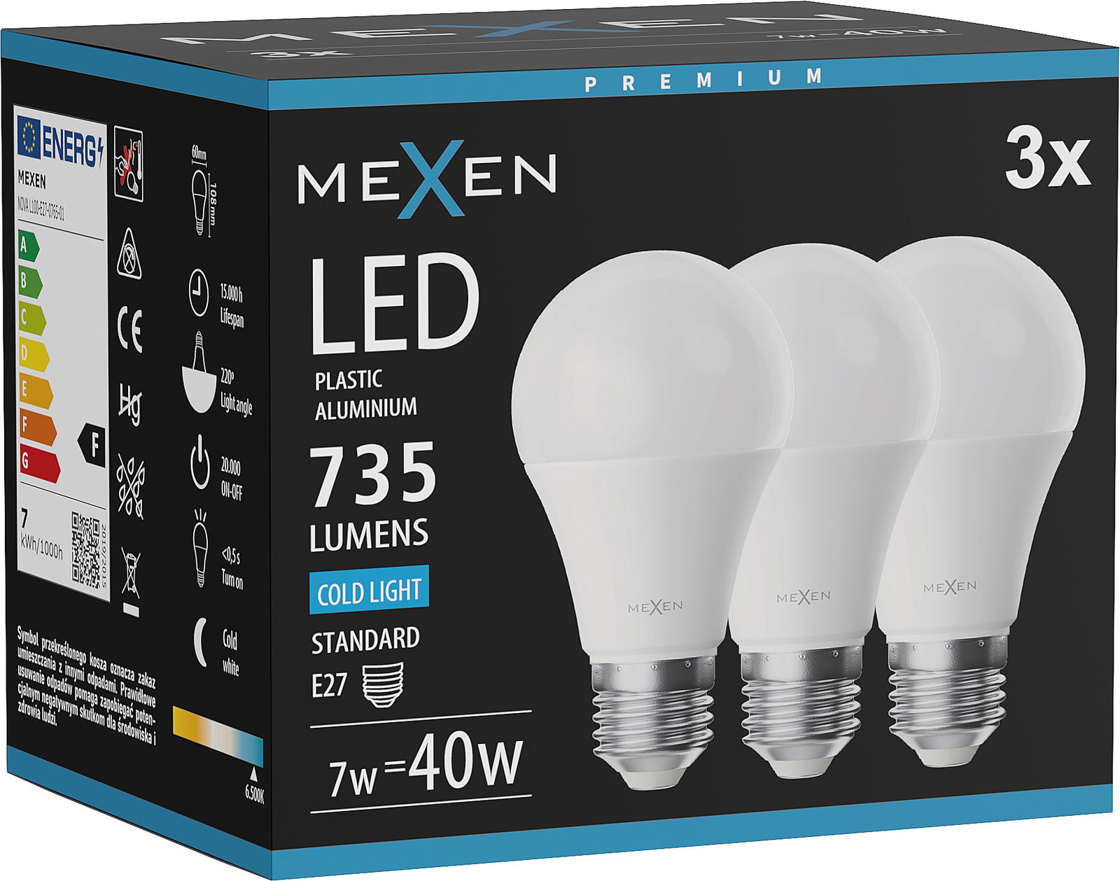 Mexen Nova 3x LED žarnica E27, A60, 7W, Hladna - 6500K, 735 lm - L100-E27-0765-01x03