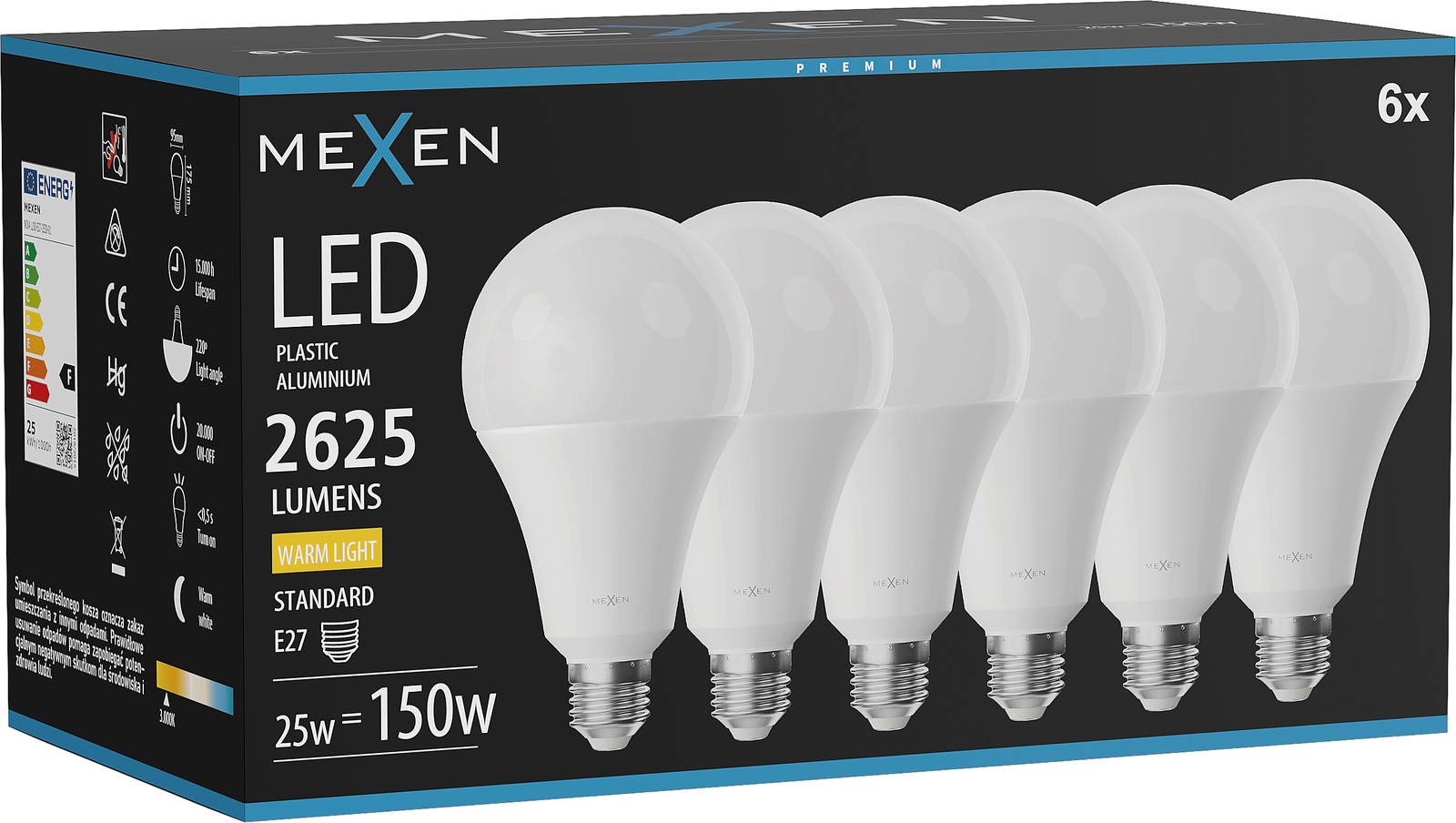 Mexen Nova 6x LED žarnica E27, A95, 25W, Topla - 3000K, 2625 lm - L100-E27-2530-01x06