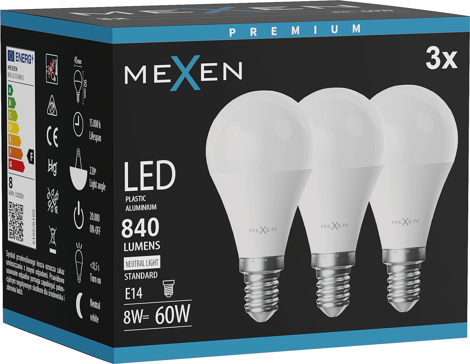 Mexen Nova 3x LED žarnica E14, G45, 8W, Nevtralna - 4000K, 840 lm - L101-E14-0840-01x03