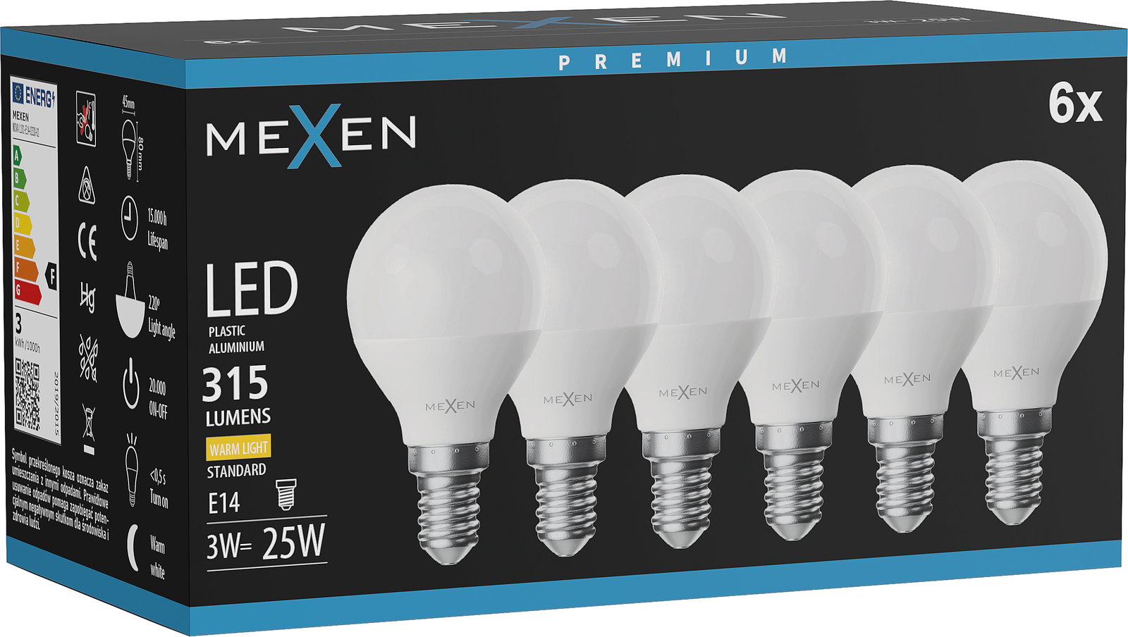 Mexen Nova 6x LED žarnica E14, G45, 3W, Topla - 3000K, 315 lm - L101-E14-0330-01x06