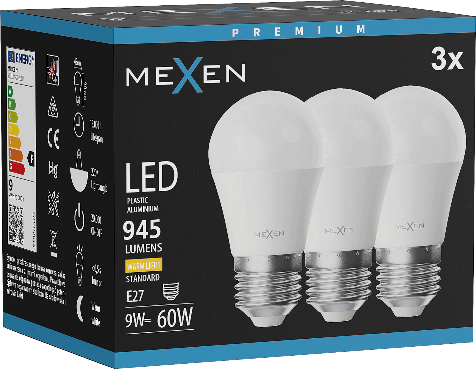 Mexen Nova 3x LED žarnica E27, G45, 9W, Topla - 3000K, 945 lm - L101-E27-0930-01x03