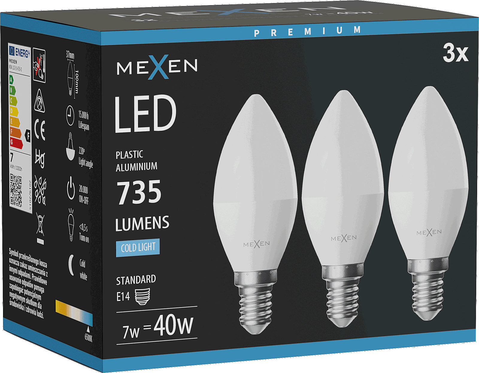 Mexen Nova 3x LED žarnica E14, C37, 7W, Hladna - 6500K, 735 lm - L102-E14-0765-01x03