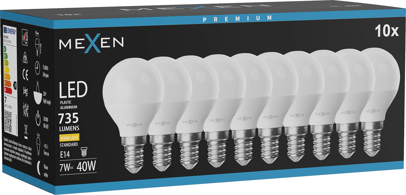 Mexen Nova 10x LED žarnica E14, G45, 7W, Topla - 3000K, 735 lm - L101-E14-0730-01x10