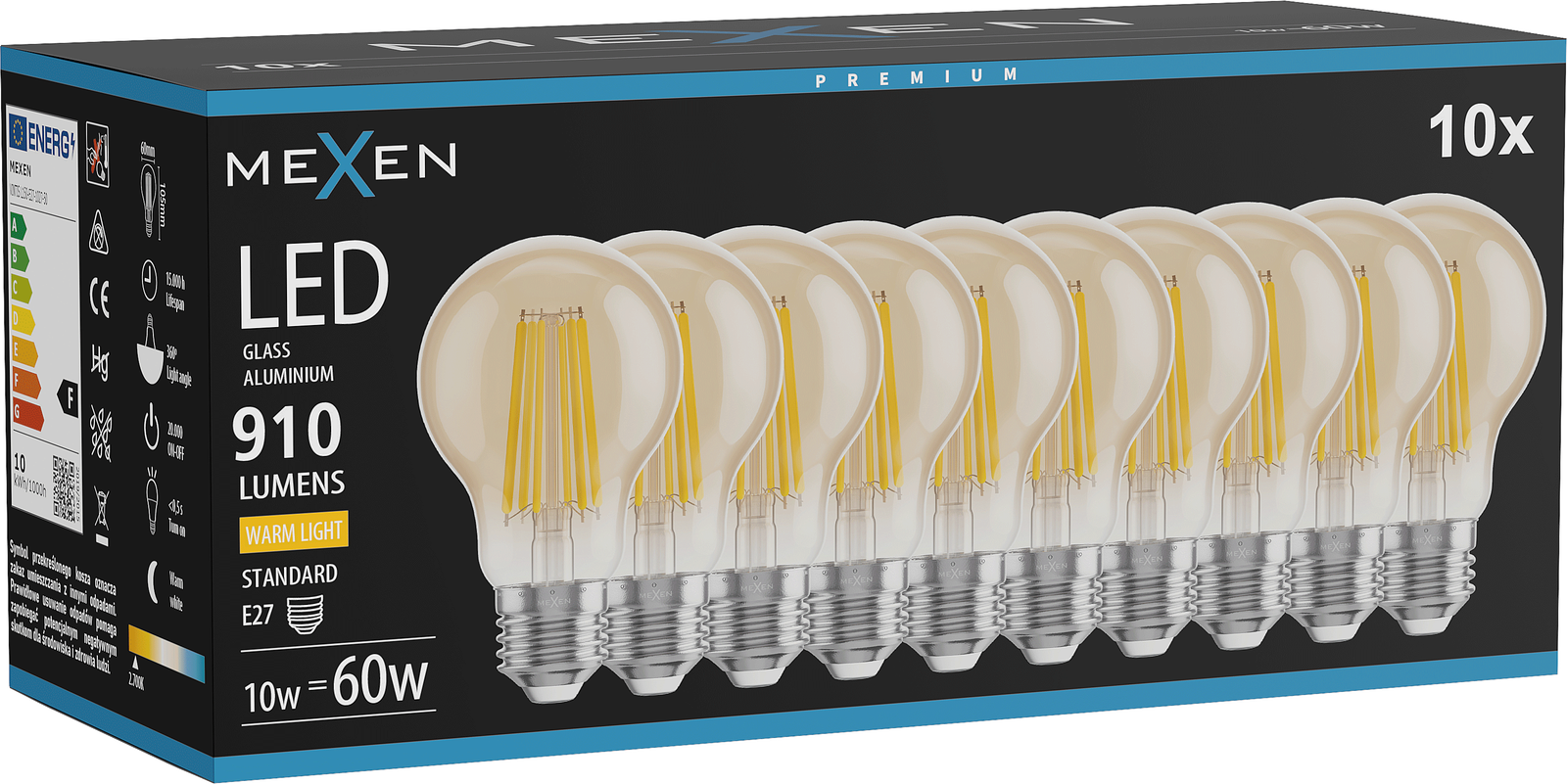 Mexen Vintis 10x LED nitka žarnica E27, A60, 10W, Topla - 2700K, 910 lm, jantar - L150-E27-1027-50x10