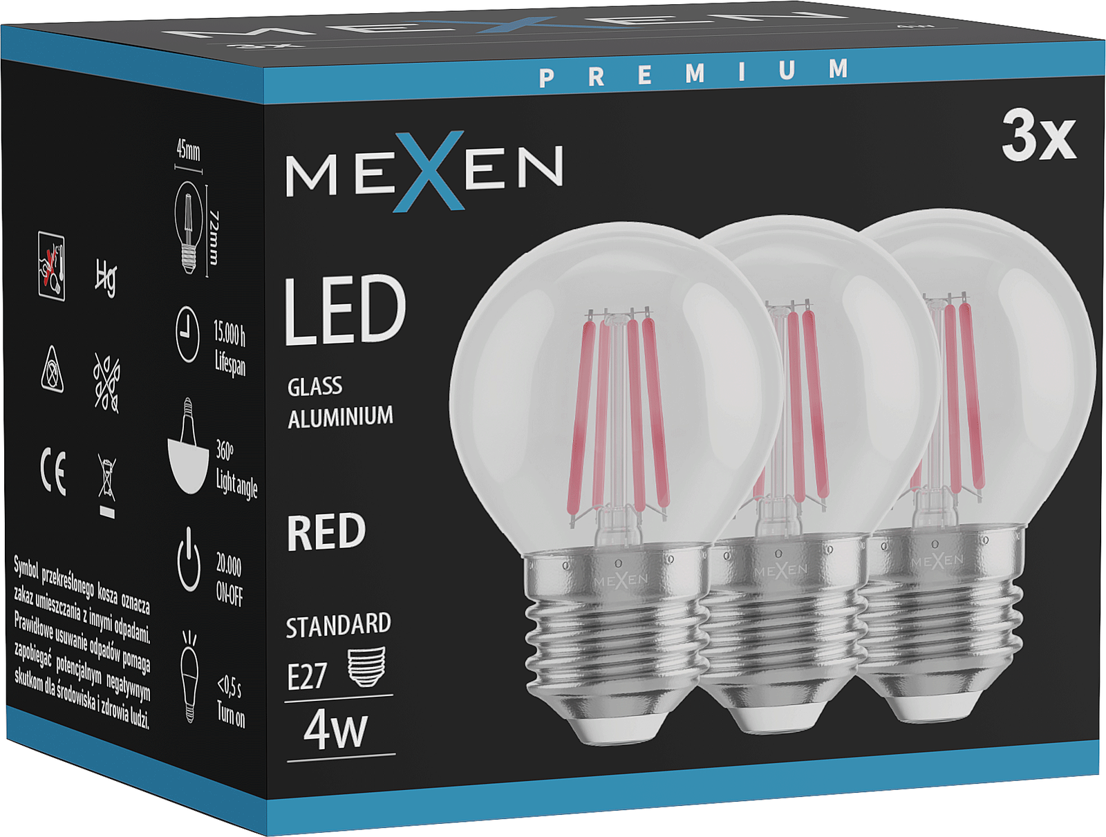 Mexen Vintis 3x LED žarnica s filamentom E27, G45, 4W, 55 lm, rdeča - L156-E27-04XX-45x03