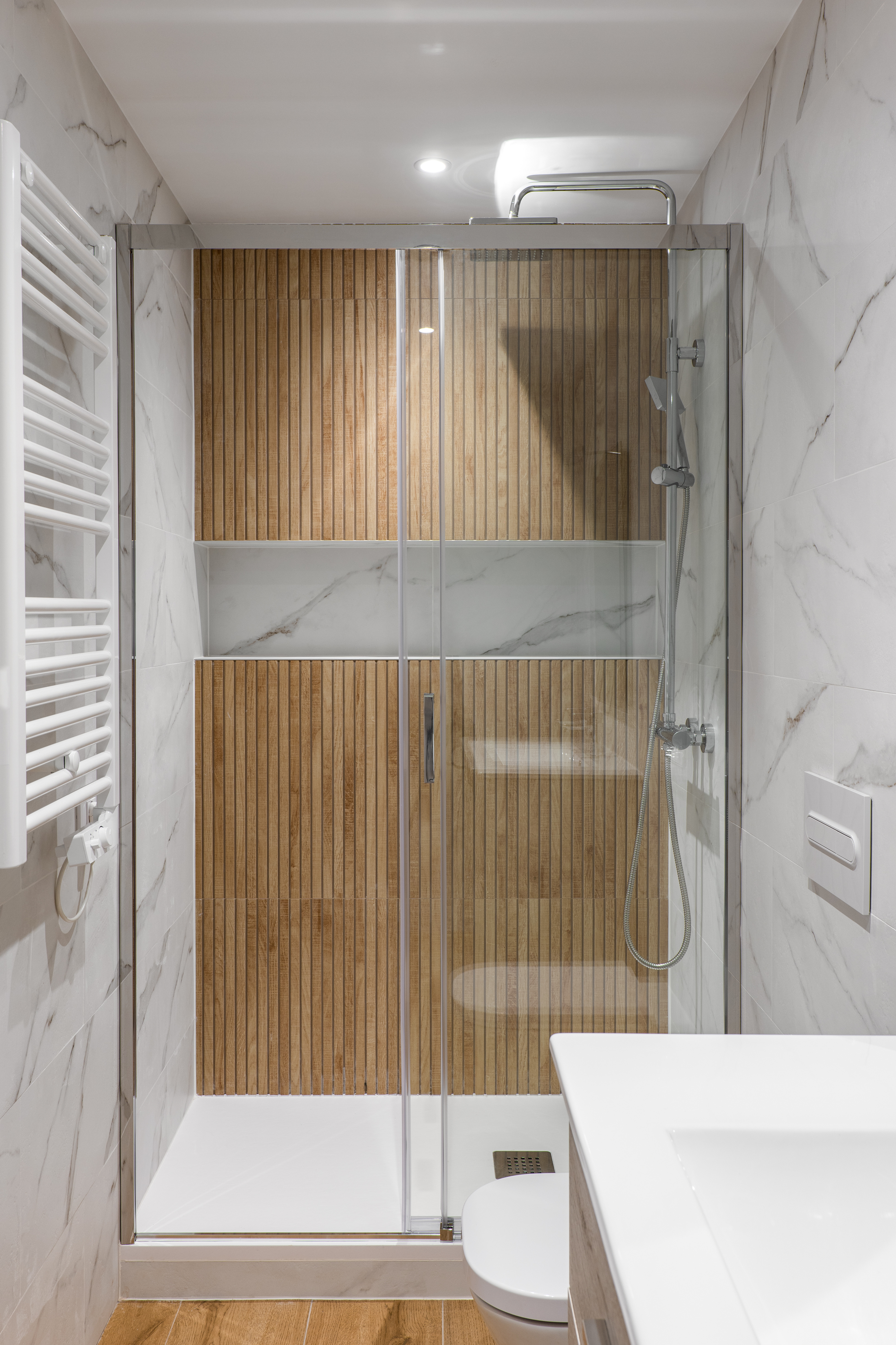 Zunaj, nad ometom, se nahajajo le pršna cev, pršna glava in pipa. Celoten pršni sistem, ki ga sestavlja podometni okvir z vsemi potrebnimi elementi, je skrit v steni. Zahvaljujoč temu je mogoče majhno kopalnico urediti na stilski način, ne da bi bilo treba namestiti veliko kabino.
