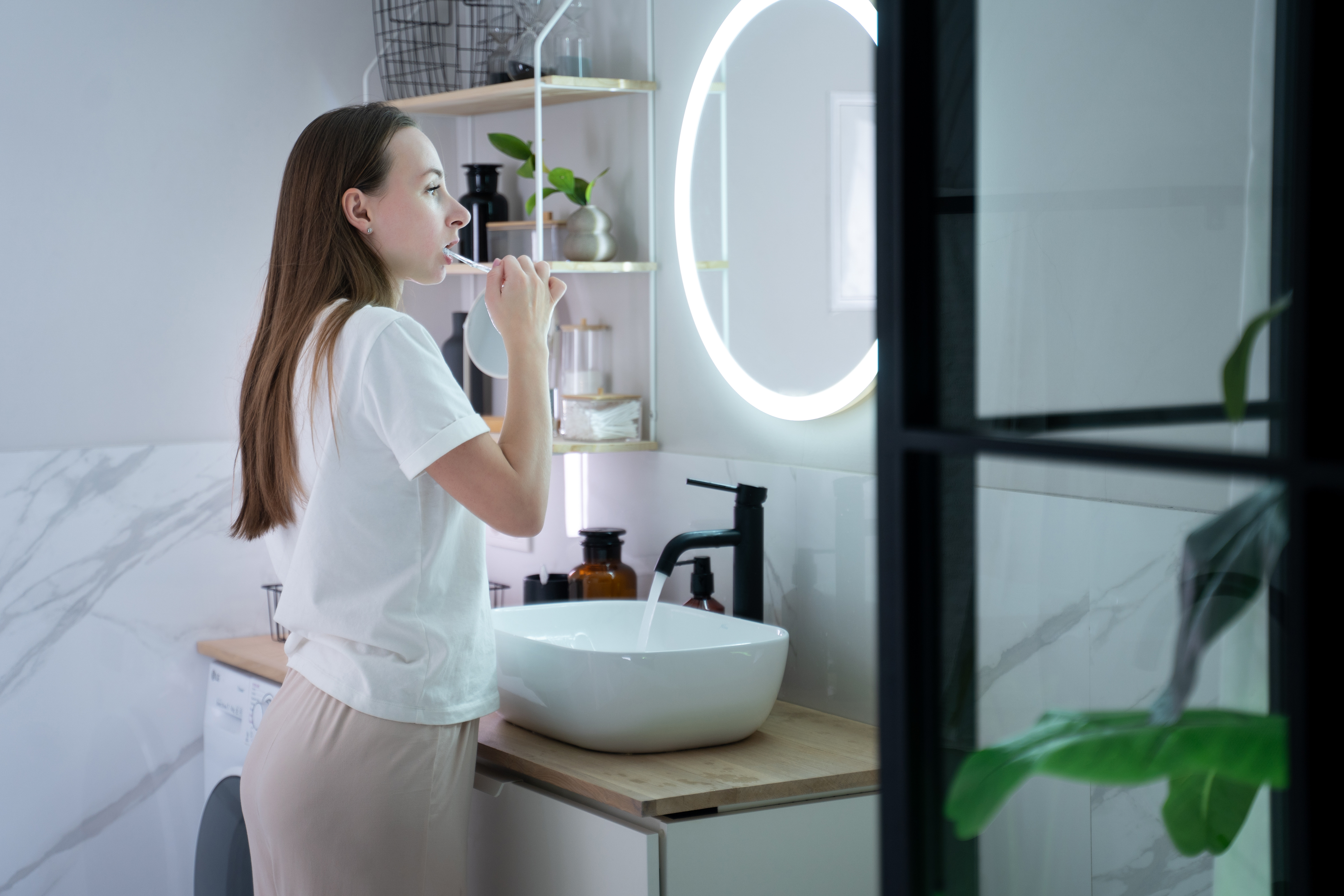 Če ste med tistimi, ki jim je ideja DIY tuja, a vseeno želite na izviren način urediti prostor kopalnice, vam ni treba nič risati ali lepiti na ogledalo. Dovolj je, da pod ogledalom in okoli njega postavite nekaj okrasnih elementov. Ti lahko vključujejo kopalniške dodatke v izvirnih barvah in oblikah, dekorativne svetlobne elemente. Odlična ideja se lahko izkaže LED osvetlitev, nameščena okoli ogledala ali stenske svetilke, obešene na obeh njegovih straneh. Odličen dodatek so lahko tudi žive rastline, ki se odražajo v ogledalu.
