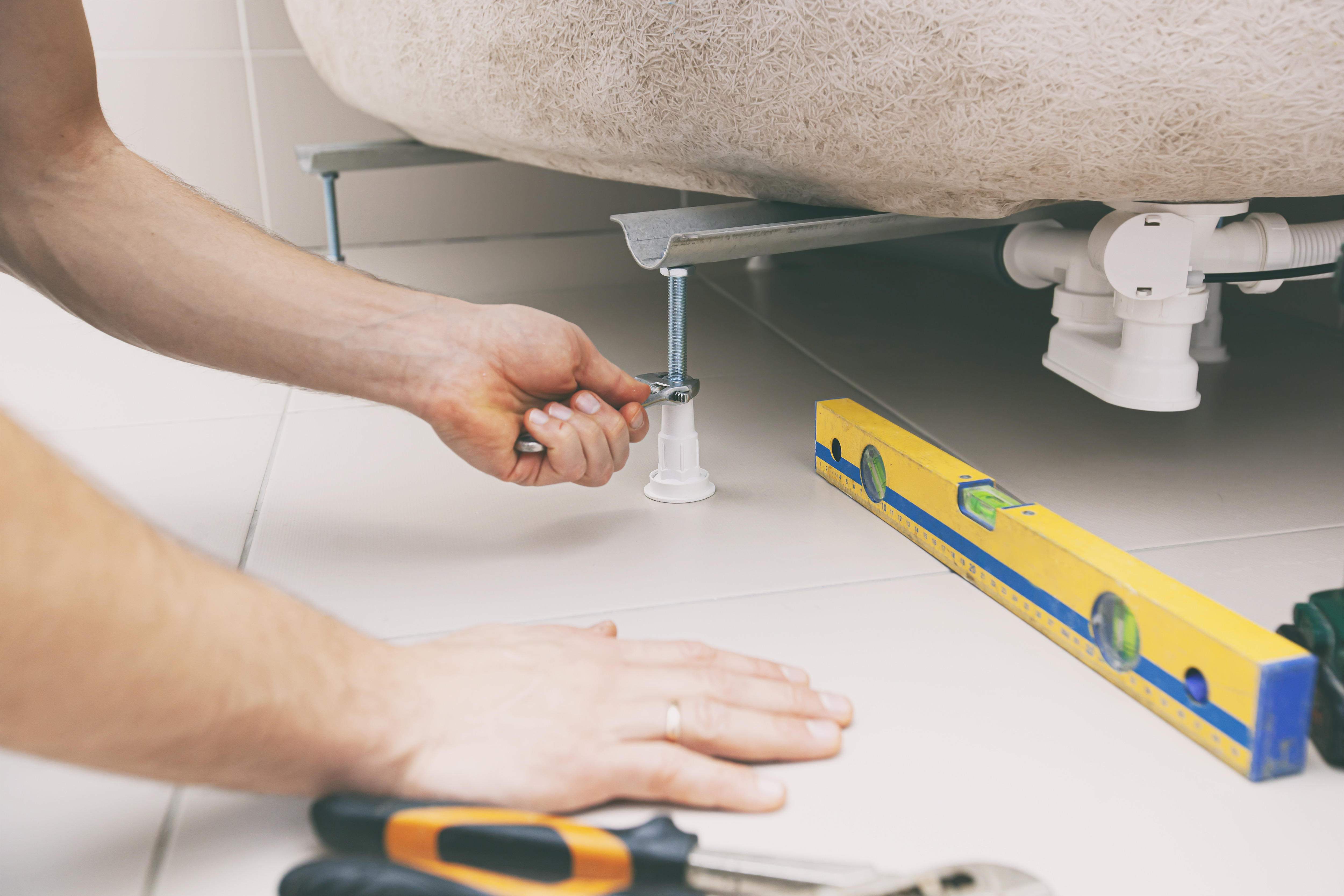 - nastavite višino tuš kadi z zategovanjem nog in njihovo namestitvijo na ploščice,